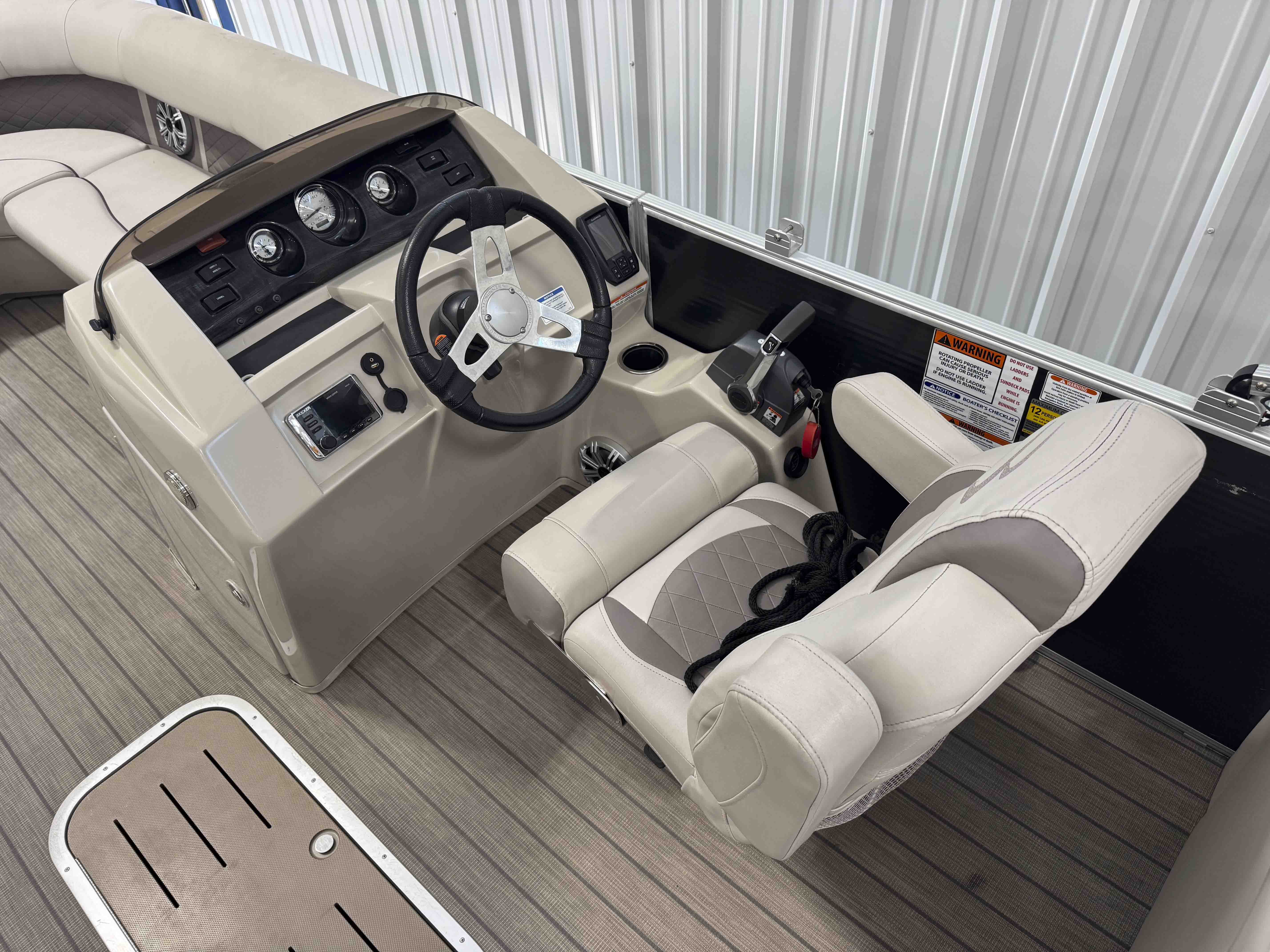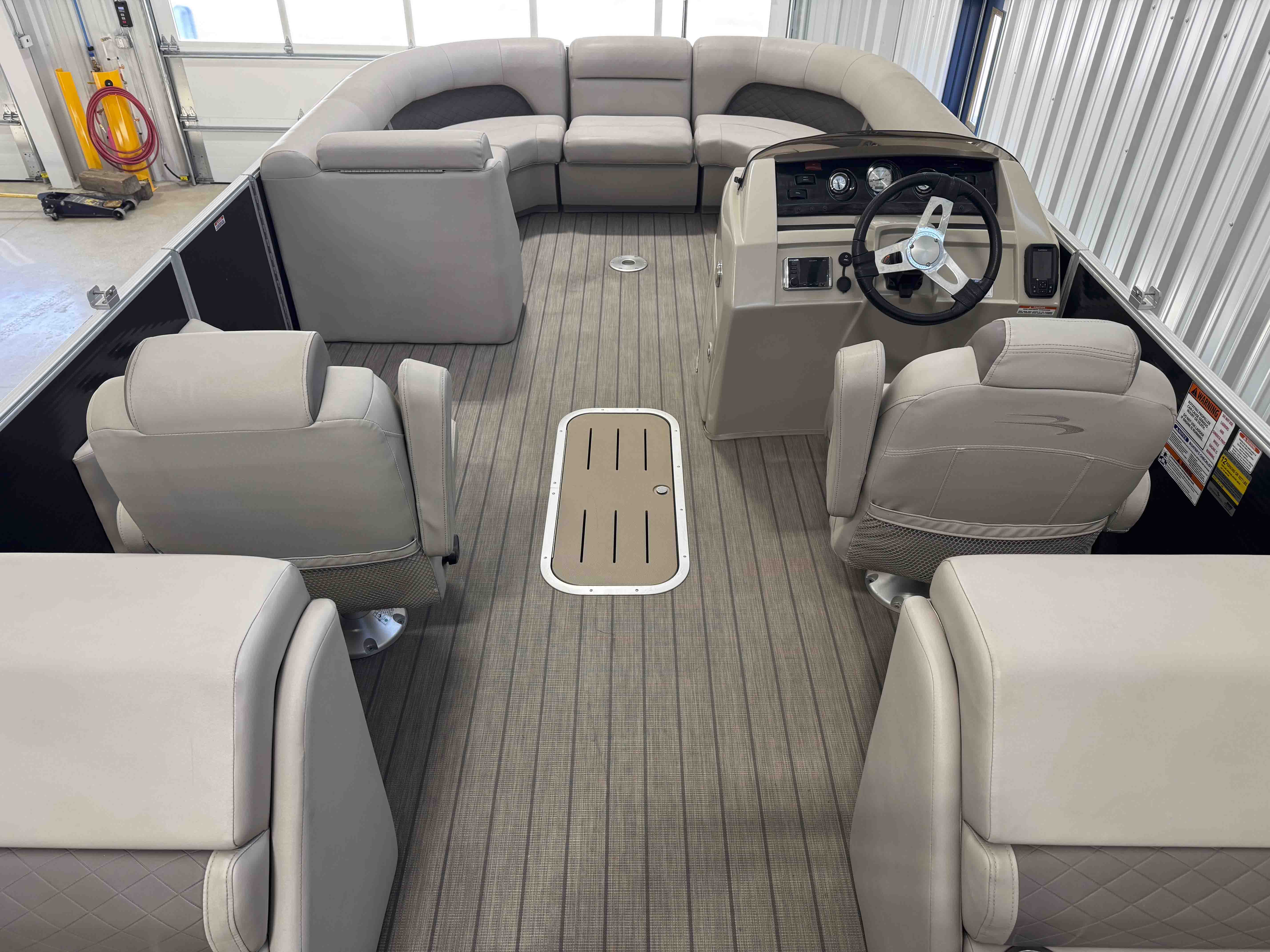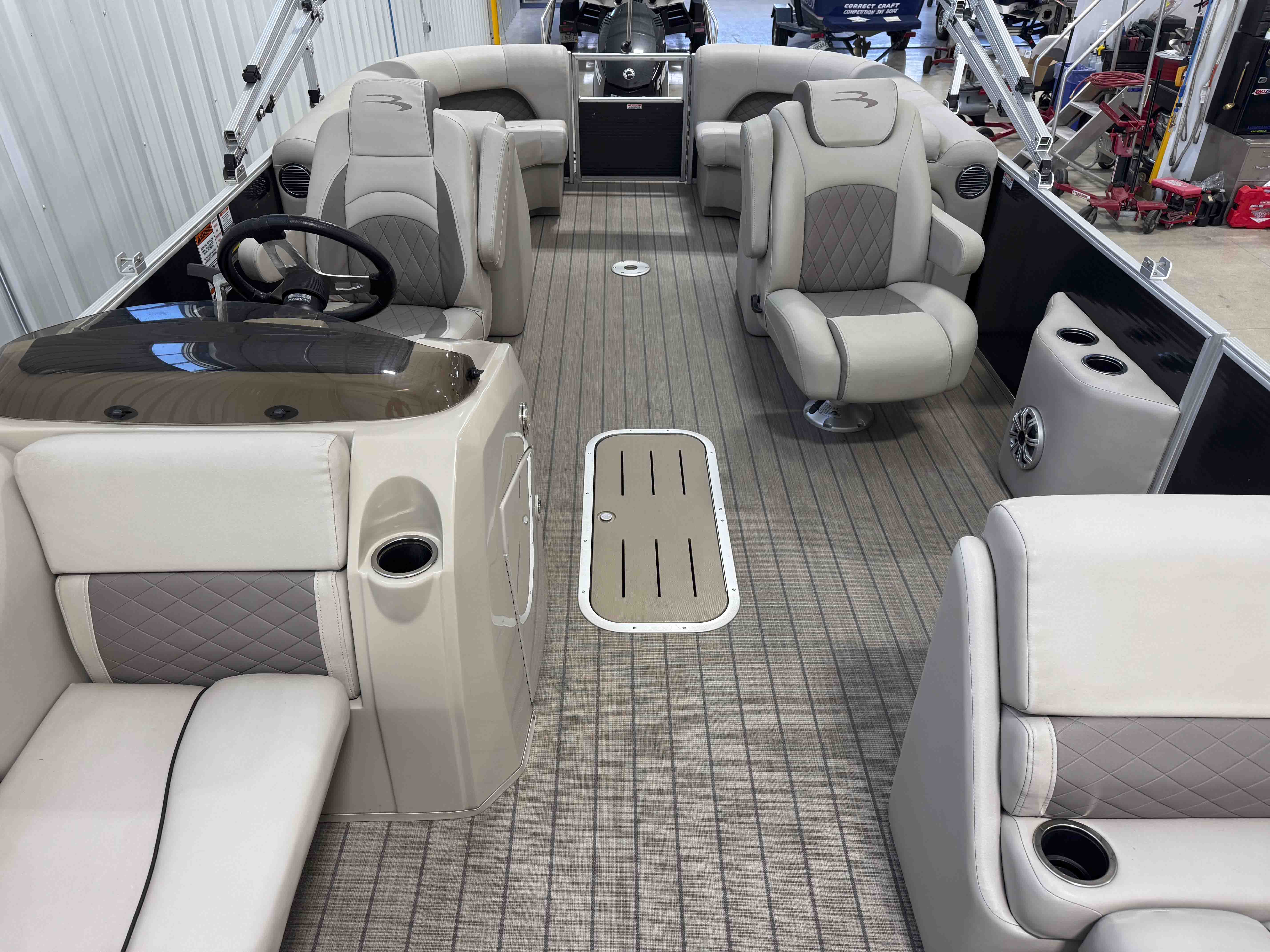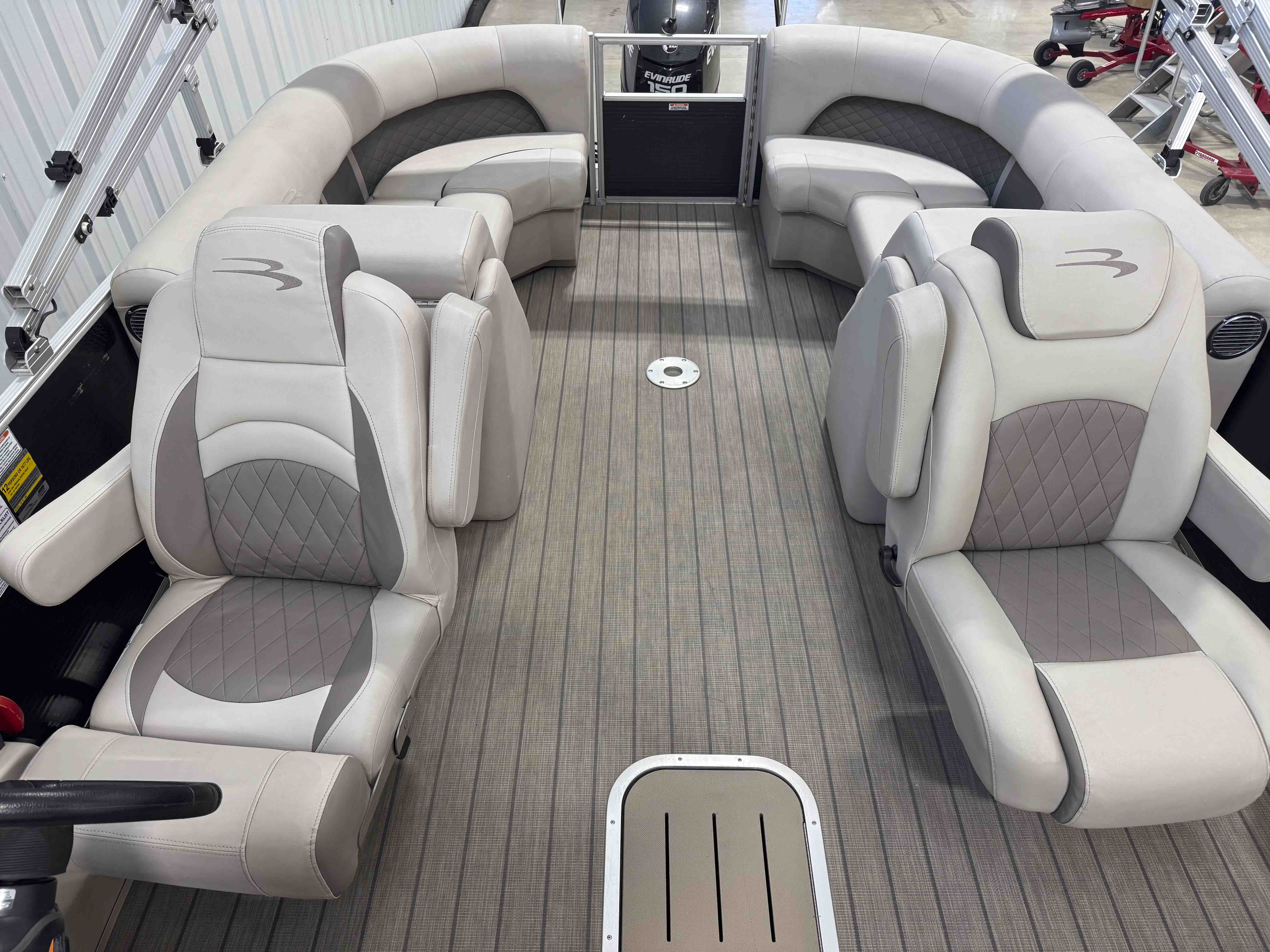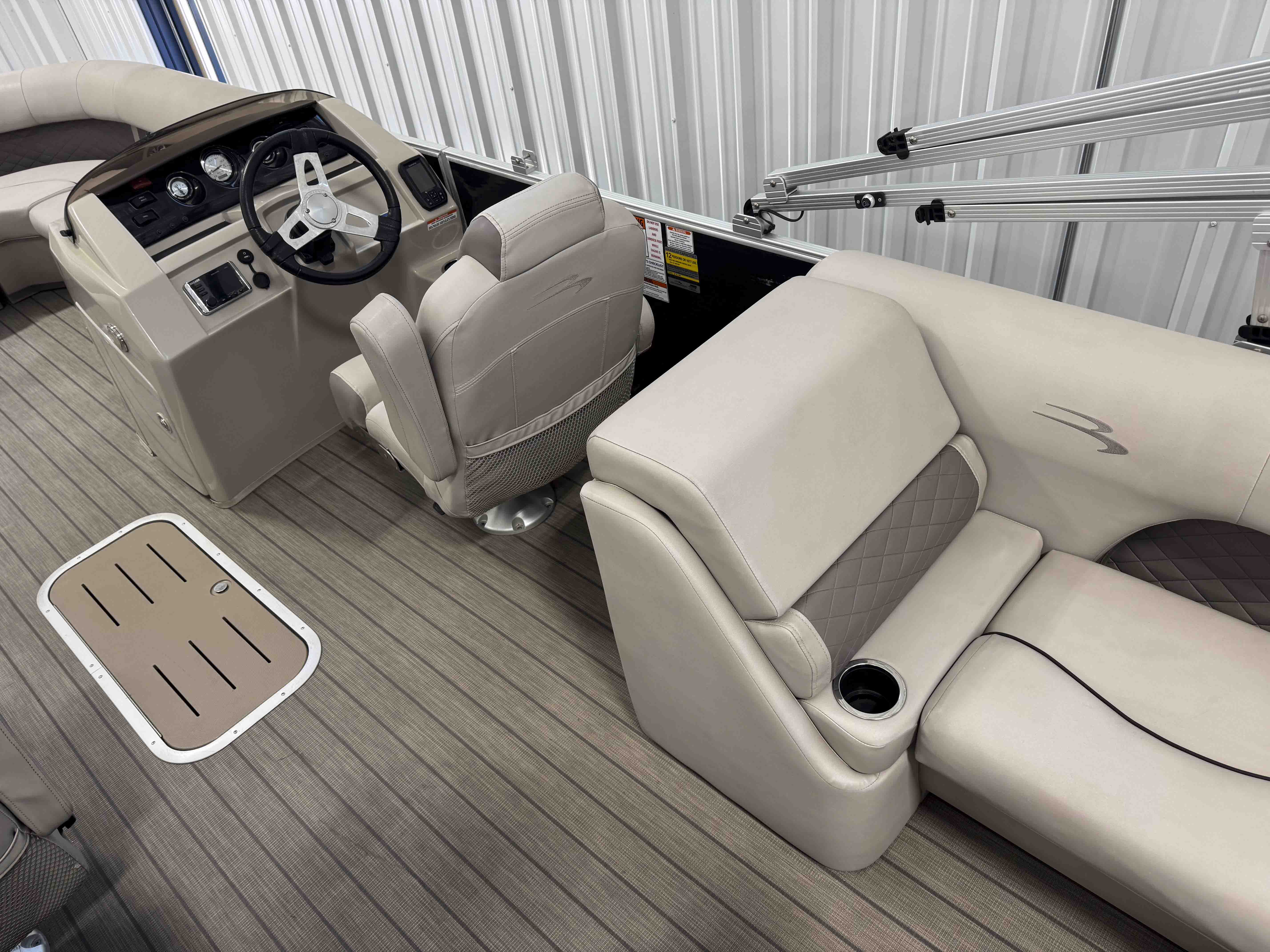 The 24SSRX blends classic Bennington comfort with a sporty, upscale feel, creating an inviting space for relaxed days on the water. Its smooth ride, clean lines, and well-balanced layout make it easy to cruise, anchor, and enjoy unhurried time with family and friends. Inside, plush lounge seating surrounds the cockpit, offering generous space to stretch out and settle in. The helm is designed for comfortable, straightforward control, while integrated storage keeps the deck organized and open. It’s a pontoon built for enjoyable lake days with the refinement Bennington is known for.